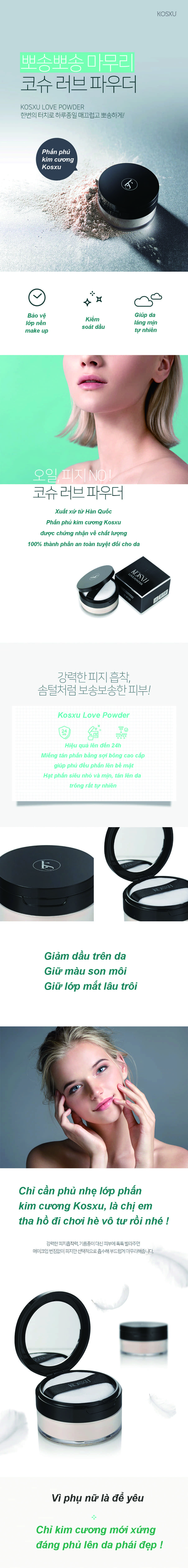Phấn phủ kim cương Kosxu, kim cương ở đây không chỉ đơn thuần là cái tên mà còn là thông điệp cao quý mà sản phẩm hướng đến. Chỉ kim cương mới xứng đáng dính trên da của phái đep, vì phụ nữ là để yêu.